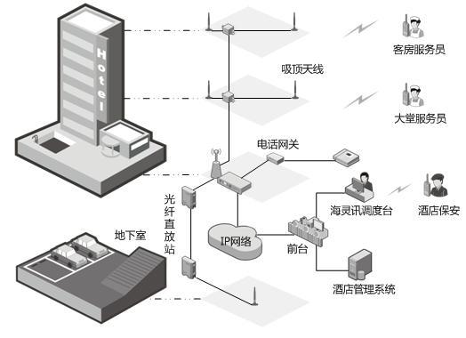 本方案采用先進的數(shù)字對講系統(tǒng)(PDT常規(guī)/集群)及專業(yè)的信號覆蓋技術(光纖直放站等)解決酒店通信管理過程中面臨的問題。數(shù)字對講系統(tǒng)能夠為用戶提供高效的實時語音和數(shù)據(jù)業(yè)務,能夠實現(xiàn)個呼通話、分組通話、全呼通話和短信息,滿足酒店管理人員和各種工作人員的業(yè)務需求;數(shù)字對講系統(tǒng)調度管理軟件(海靈訊)在實現(xiàn)智能語音調度的同時也可與酒店管理系統(tǒng)實現(xiàn)業(yè)務對接,通過數(shù)字對講機實現(xiàn)工作單的自動派發(fā)。